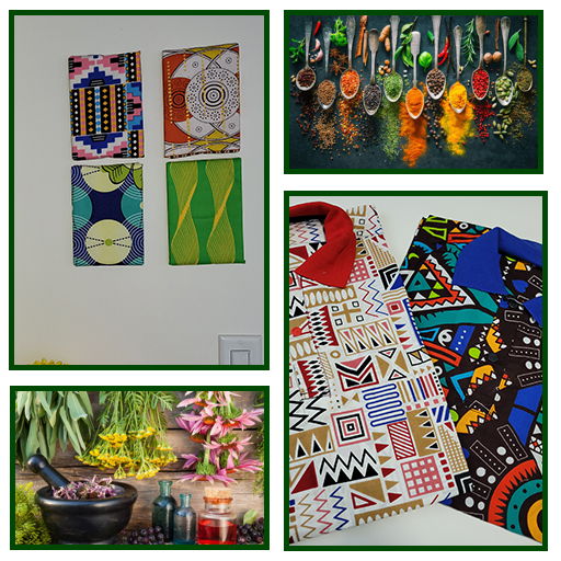 Dried hibiscus flower, Cocoa butter, Roasted cocoa beans, Moringa leaves powder, Moringa herbal tea, Curcuma (turmeric) powder, Baobab powder, Ginger powder, Cloves, Bay leaves, Raw cocoa powder